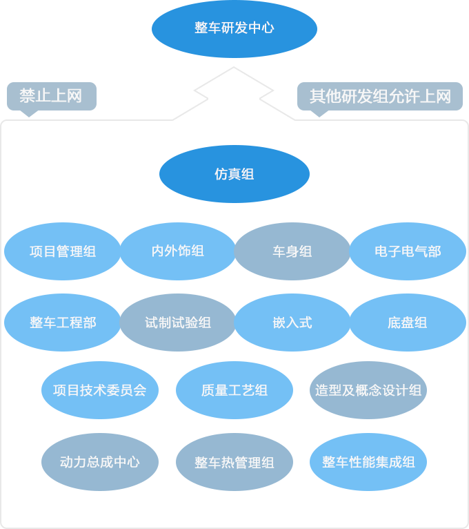 整車研發(fā)中心管理策略:1. 仿真組禁止上互聯(lián)網(wǎng),其他研發(fā)組可以上互聯(lián)網(wǎng),所有研發(fā)組可以互通加密文檔